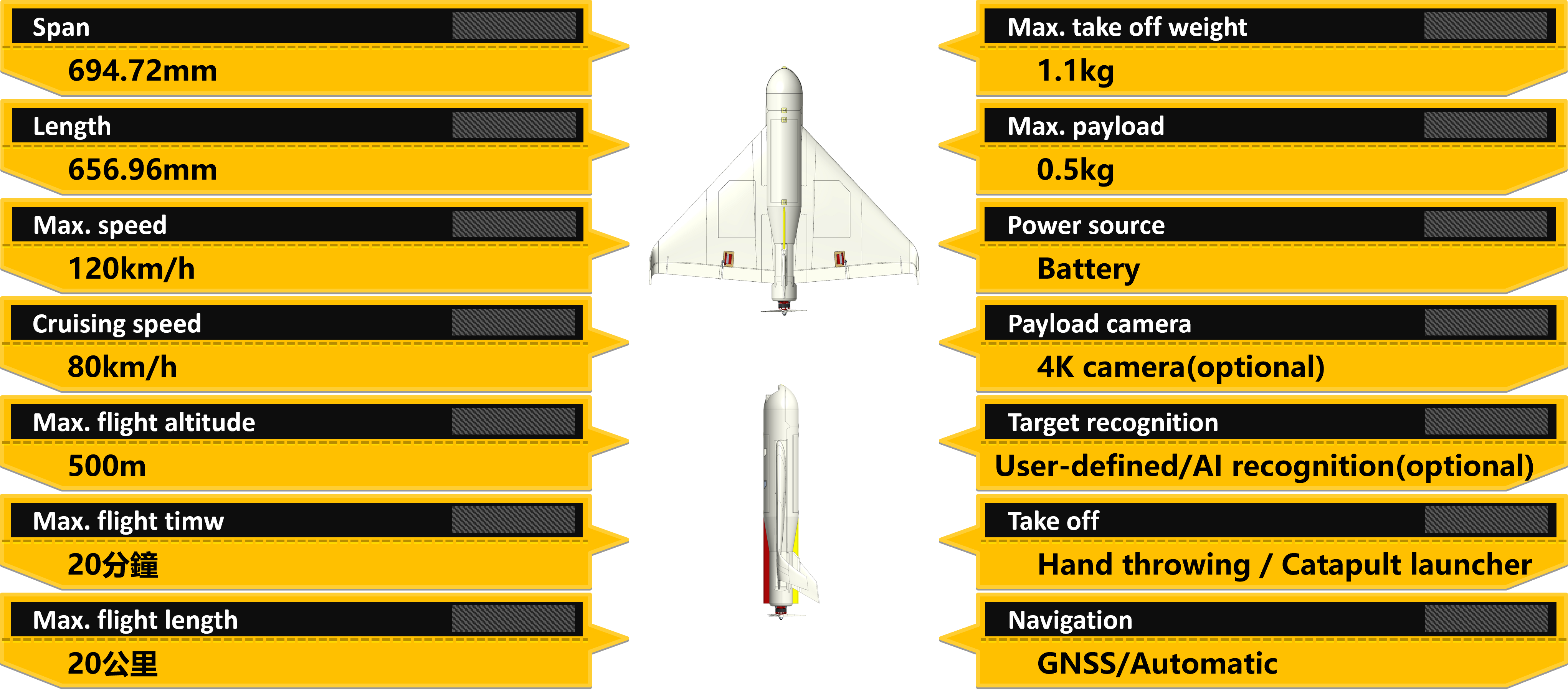 FLYINGFISH Series Drone MissilesThe world’s most cost-effective loitering munition — simple to assemble, easy to operate, and capable of fully autonomous flight while being difficult to jam or intercept. With a payload capacity of 500 grams, it can carry various types of ordnance to replace conventional grenades and mortars, reducing soldier casualties and enabling true Beyond-Visual-Range (BVR) precision strikes to effectively enhance national defense capabilities. It can also be equipped with a variety of imaging systems or AI recognition modules to support aerial mapping, environmental monitoring, and intelligence-gathering missions.