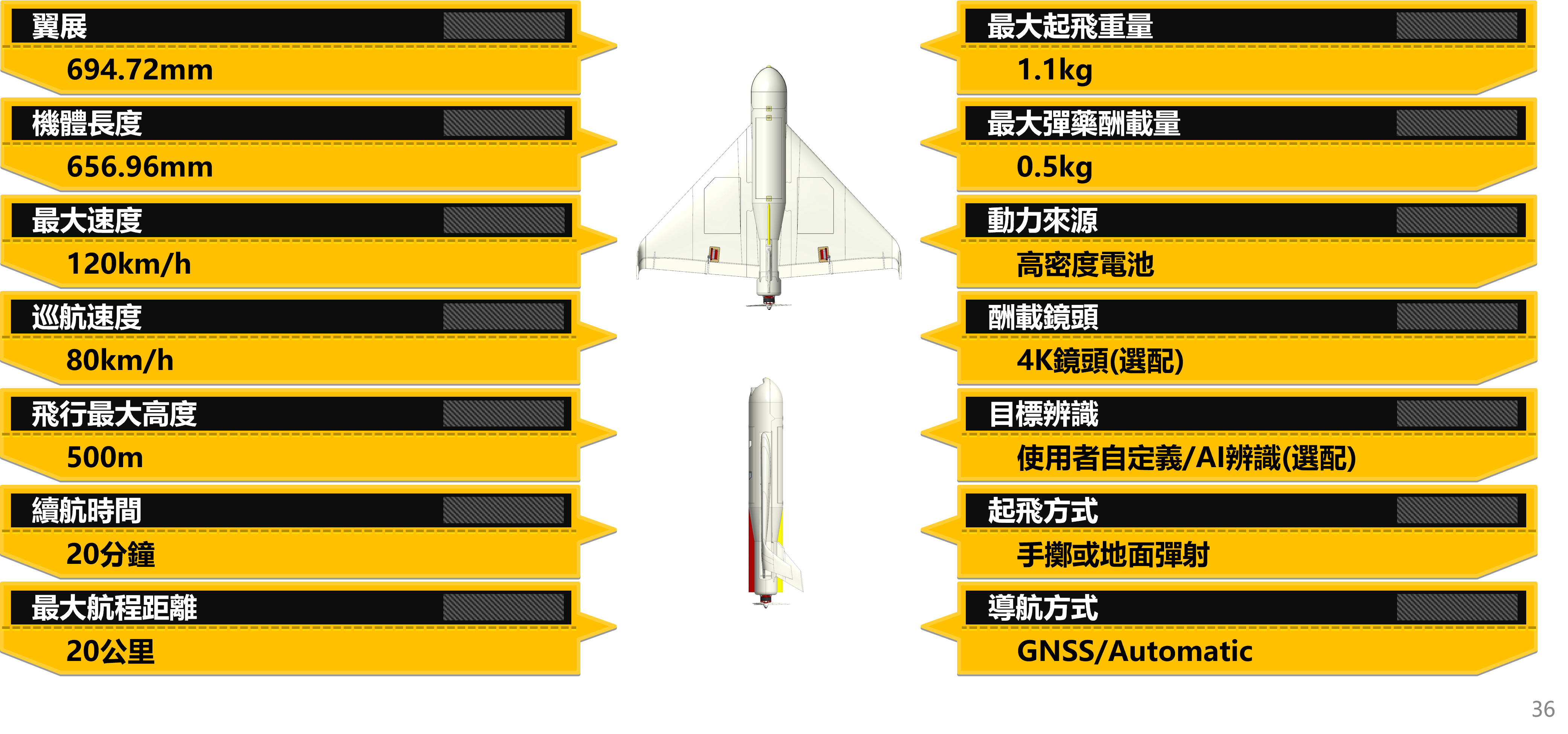 全球性價比最高的自殺式無人機,組裝簡單、操作簡易、全自動飛行且難以干擾或攔截,酬載能力500公克,可酬載各式火力,取代傳統手榴彈及迫擊砲等制式武器,以降低士兵生命損失,達到真正視距外 (BVR | Beyond Visual Range) 精準打擊作戰,有效提昇國防戰力。亦可酬載各式影像系統或AI辨識系統,以提供空拍繪測、環境監控、情資偵搜等功能。